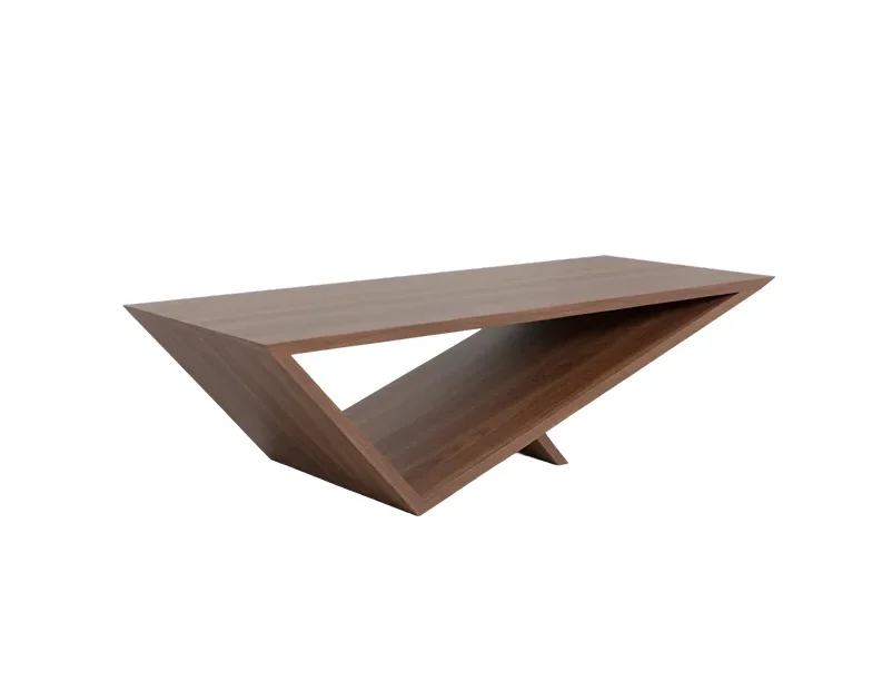 The Apex Origami features a striking geometric design, constructed from flat wooden panels. It has a single, rectangular top surface supported by a V-shaped base that also forms an open storage shelf. The base connects to the floor via a small, central support panel, creating an inverted triangular void on one side.