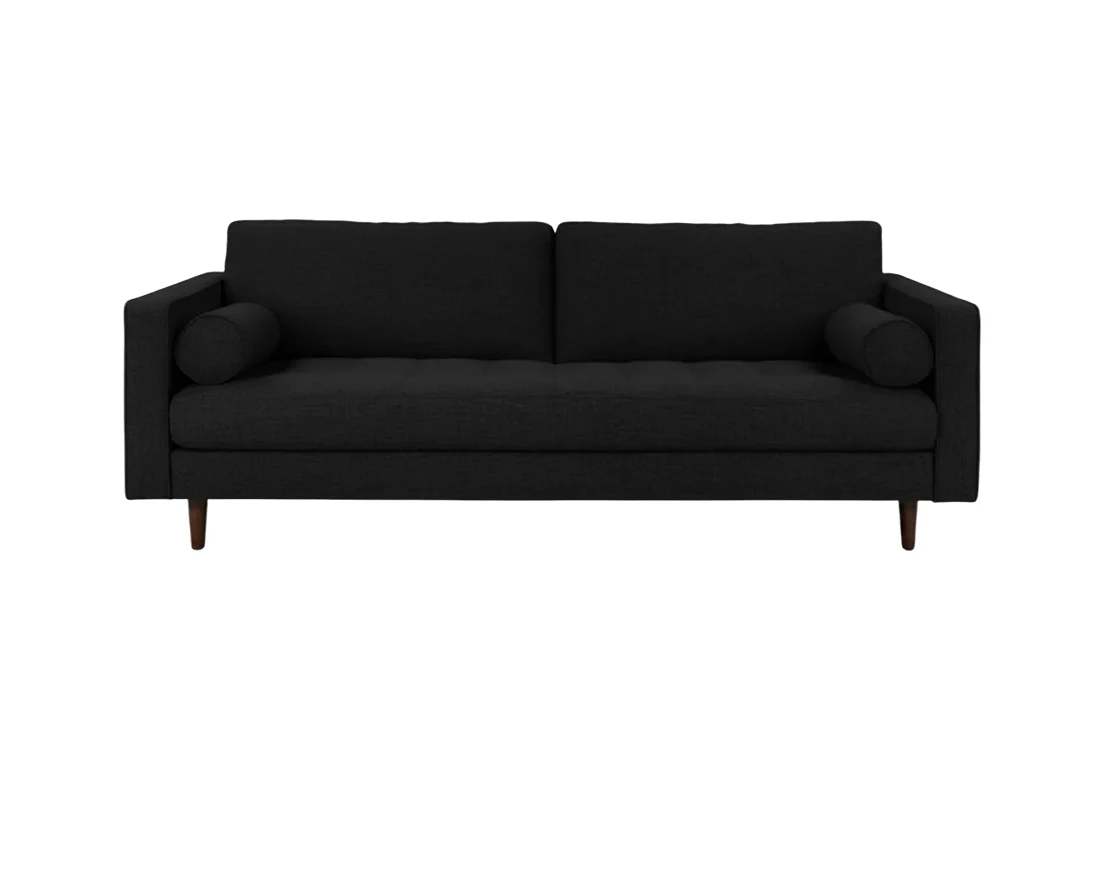 The Arrell Sofa is a study prioritizing symmetry and verticality over modular bulk. Its design features a long, singular seat cushion framed by slim, formal track arms and accented by cylindrical bolster pillows.