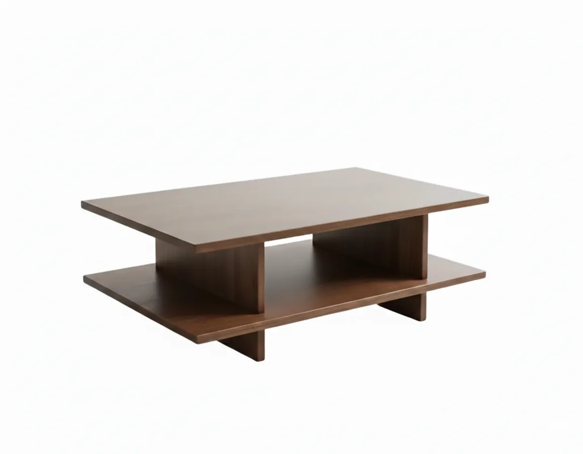 The Stratum Tier Table is defined by its layered horizontal planes and intersecting vertical supports. Its form is composed of two identical wooden slabs that are held in parallel by two thick, recessed pedestal legs. This creates a balanced, symmetrical silhouette where both the tabletop and the lower shelf appear to hover above the ground.