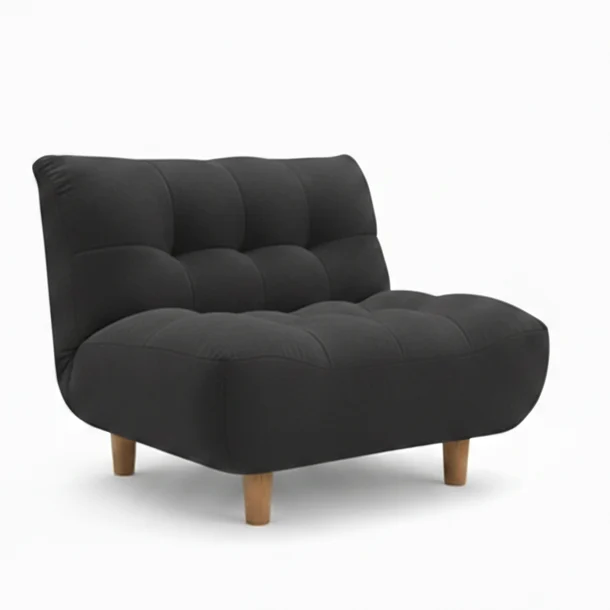 The Cloud Slipper is defined by its deeply tufted, pillowy form. Instead of a rigid frame, the seat and backrest are made of soft, bulging sections that look like large cushions joined together.