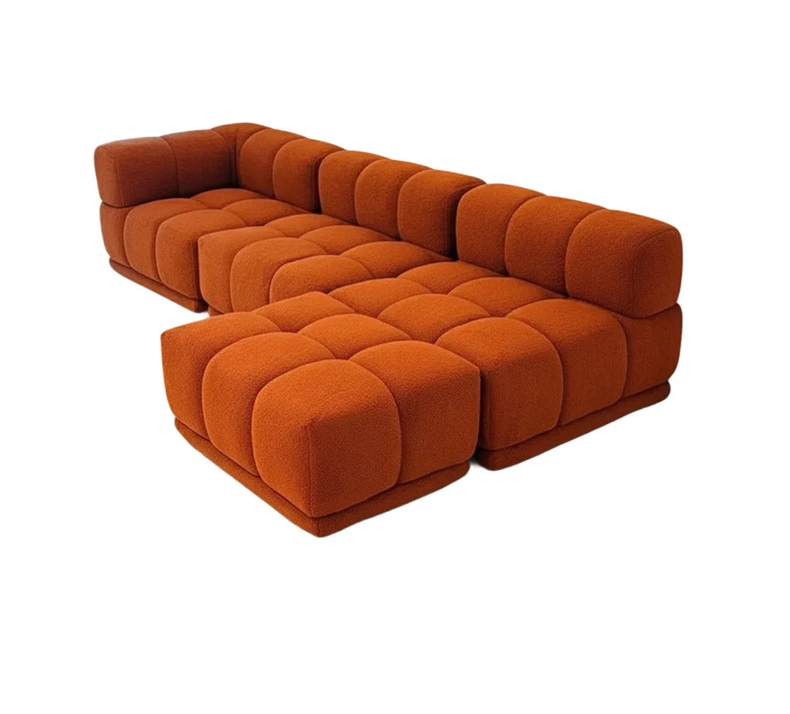 The Mosaic Sectional is a study in repetitive units and modular density. Unlike the elongated segments of the Ridge Sectional, this form is defined by a series of individual, square-profile cushions that interlock to create a structured landscape.